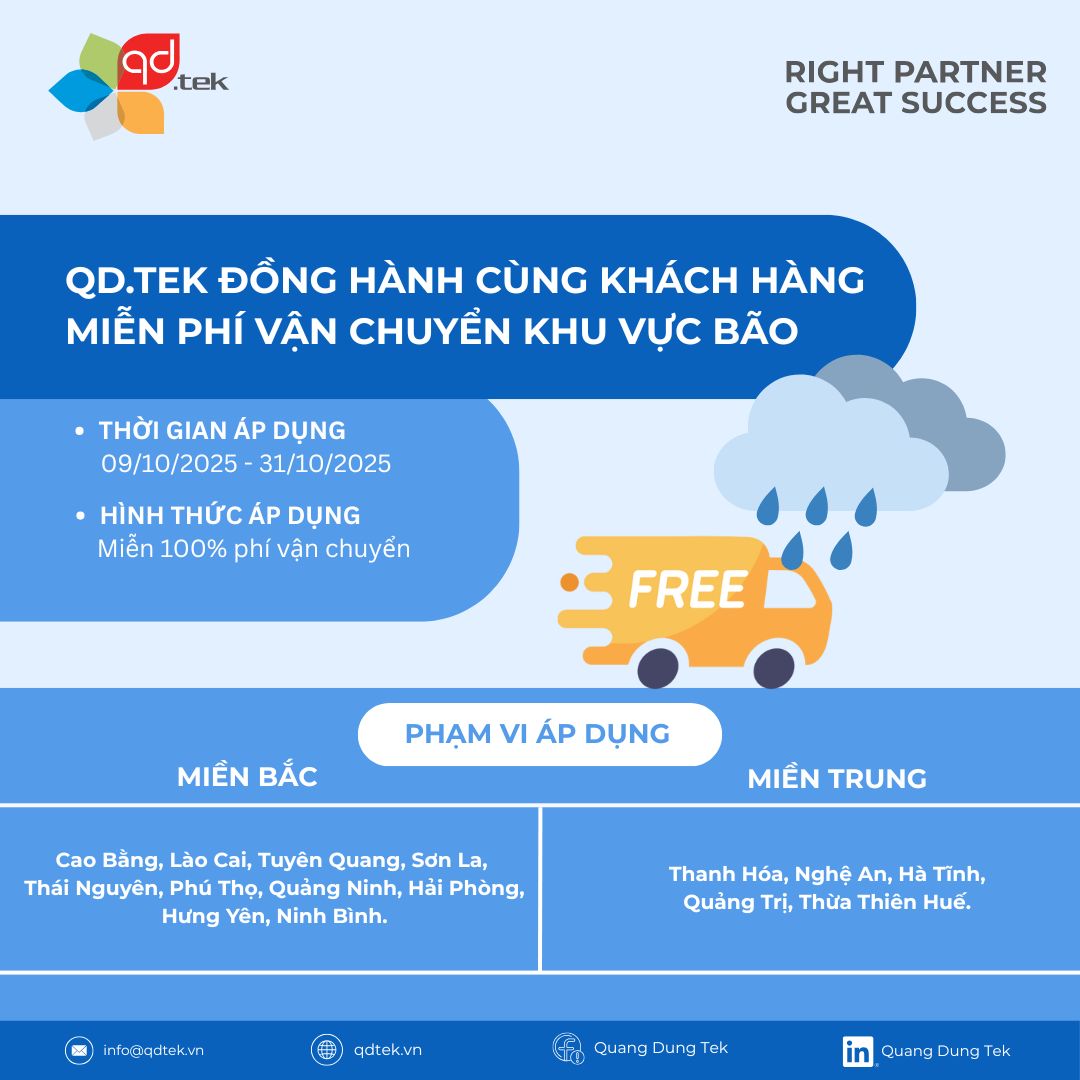 Trước diễn biến phức tạp của thời tiết và ảnh hưởng nghiêm trọng từ cơn bão số 10 và số 11 trong tháng 9 và tháng 10/2025, Công ty Cổ phần Phân phối Công Nghệ Quang Dũng (QD.TEK) triển khai chương trình hỗ trợ miễn 100% phí vận chuyển (Free Ship) đối với các đơn hàng giao đến những địa bàn bị ảnh hưởng bởi bão.